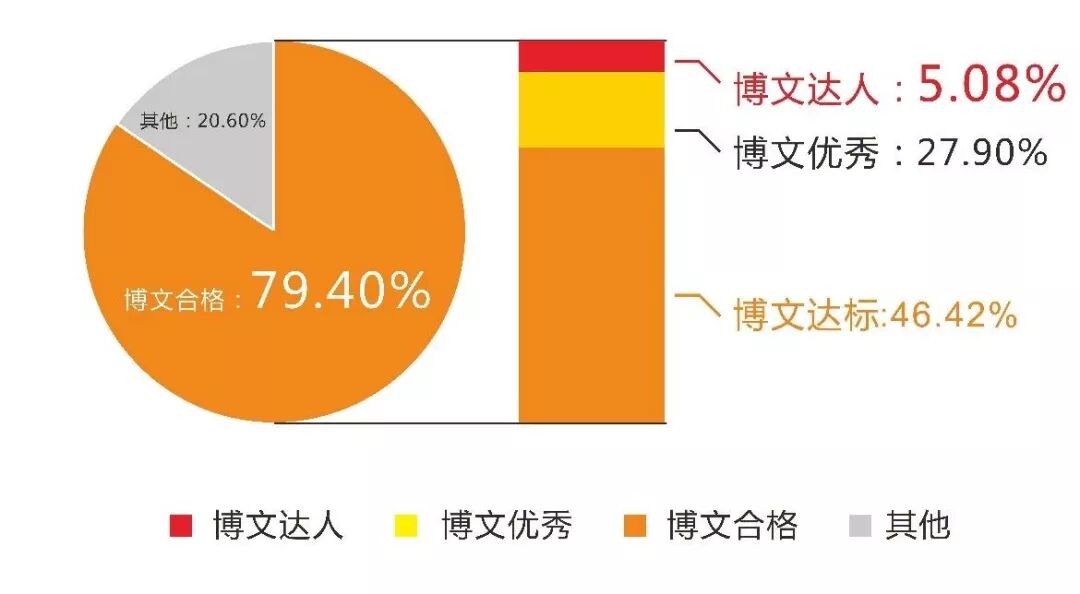 从图表和数据我们可以看出,此次比赛的合格率高达近八成,而冲刺进我们博文达人组的精英占比5.08%,知识靠积累,专业靠沉淀,希望大家可以每天保持备战状态,向着融易达人冲刺,向着目标前进!